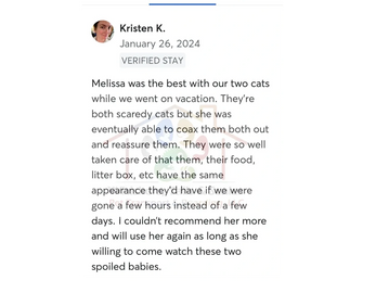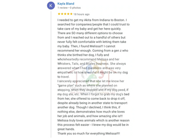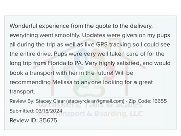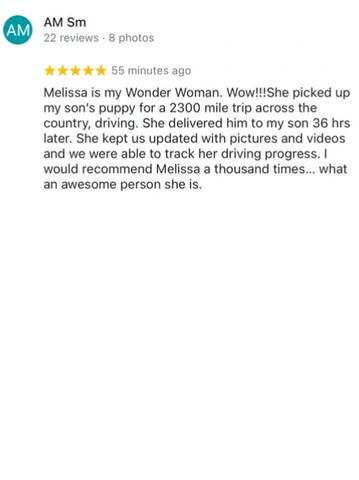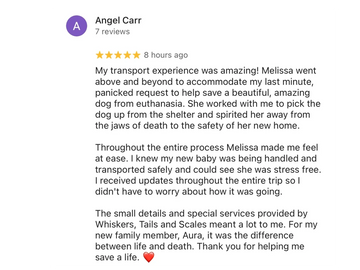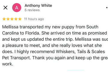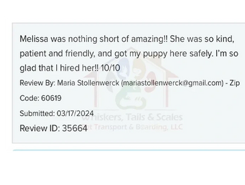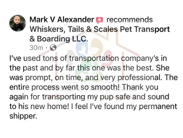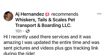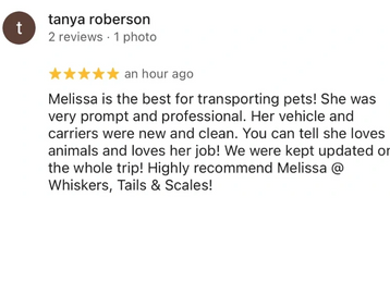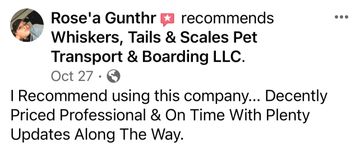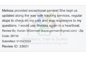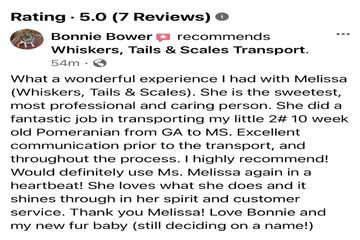 My name is Melissa and I am a professional USDA Certified pet transporter. I am the owner of Whiskers, Tails & Scales Pet Transport & Boarding, LLC. A people person and animal lover to the core. That is what prompted me to start this business. Although, I know we can’t have every animal/pet in the world right now, we sure can love yours for our short trip and/or stay together.